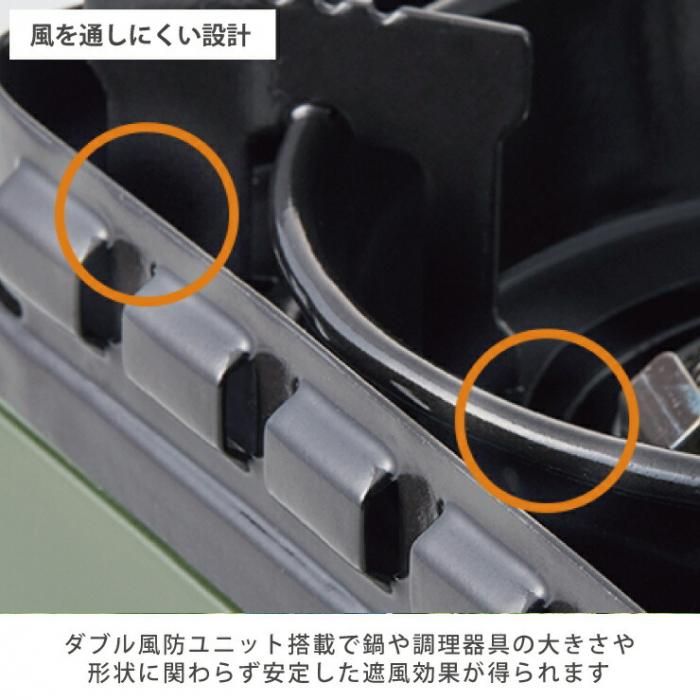 空気は通すが風は通さない「ダブル風防ユニット」搭載で、野外でも強い加熱性能が得られます。
