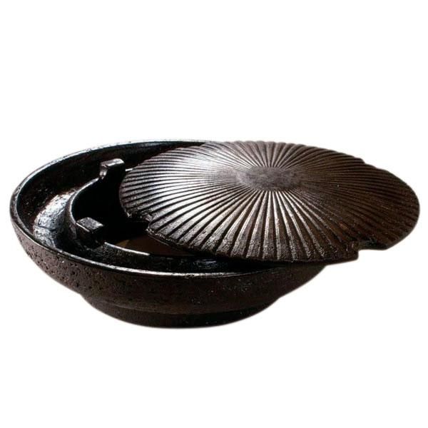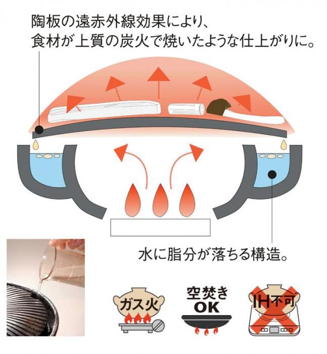 陶板の傾斜により溝に沿って余分な脂が流れてヘルシーな上、脂が直接火に落ちない構造です。脂は炉の溝に張った水に落ちます。