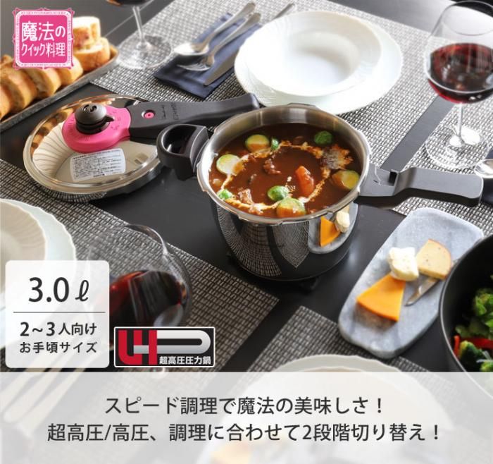 新しくなった「魔法のクイック料理」。スピード調理で魔法の美味しさ。日本最高クラスの圧力(約2.38気圧)の超高圧(約126℃)。超高圧と高圧を調理に合わせて切替えられる調圧おもりを採用。