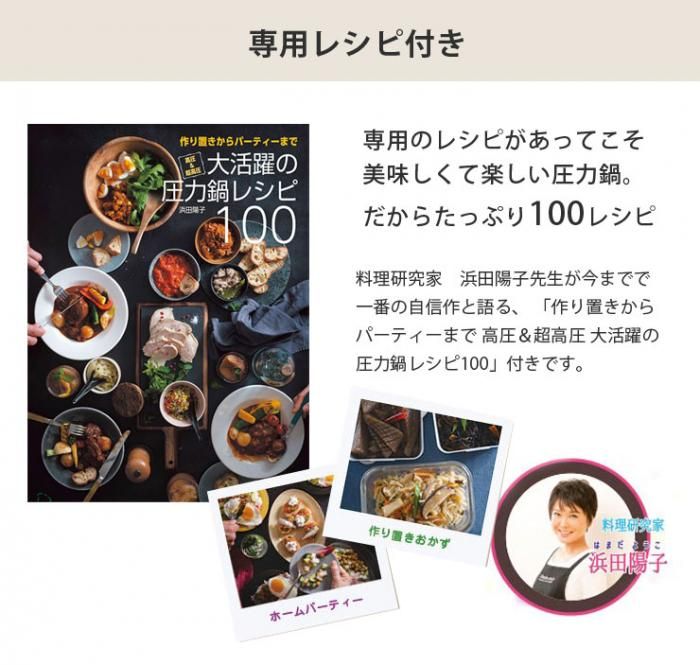 専用のレシピがあってこそ 美味しくて楽しい圧力鍋。 だからたっぷり100レシピ。これが家でパパっと作れたら嬉しいな!と思うメニューを中心に、 ホームパーティーにも大活躍すること間違いなしのレシピがたくさん入っています。