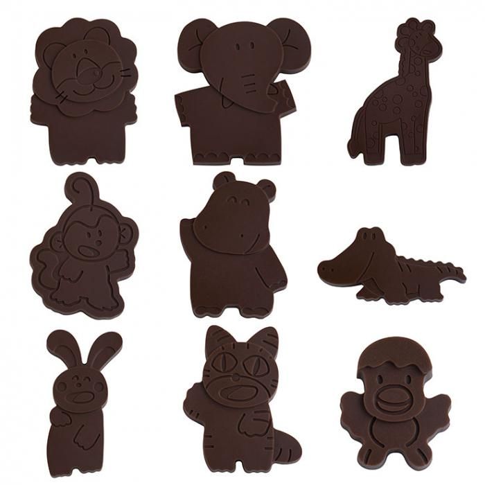 たべっ子どうぶつのパッケージに登場する9種類のキャラクターのチョコが作れるシリコーン型です。