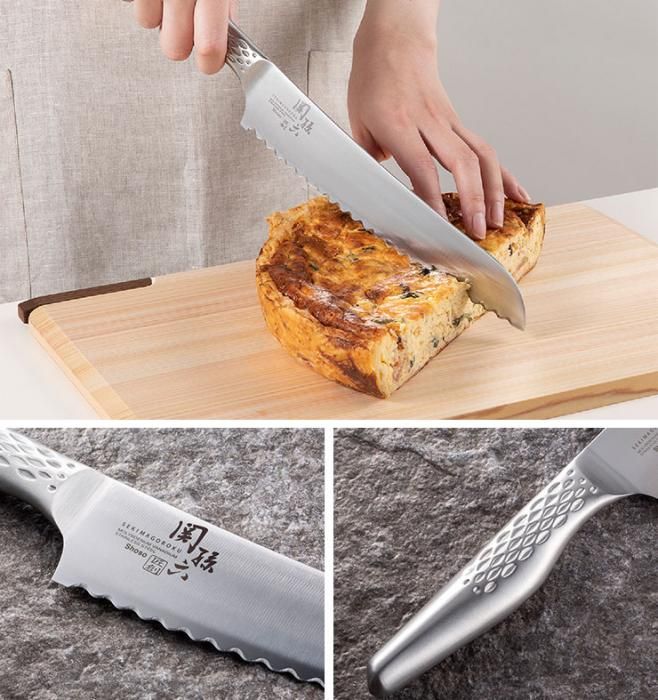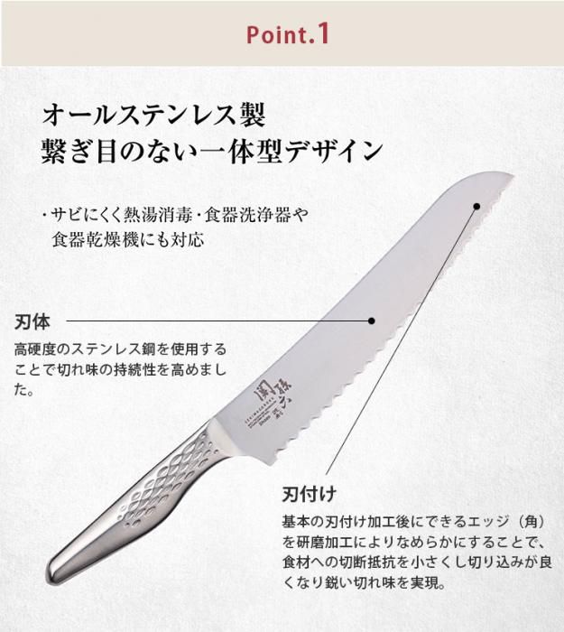 関孫六 匠創 パン切り包丁 210mm AB5167 送料無料 当日出荷 分類で探す キッチングッズ 包丁 パン切り包丁 ブランドで探す 貝印 関孫六 価格帯(税込) 3,000円台の商品 キッチン用品 送料無料 ラッピング承ります 継ぎ目のない 一体構造のオールステンレスタイプのパン切り包丁21cm 洗いやすく 熱湯消毒・食器洗浄機や食器乾燥機にも対応 指かがりが良く グリップ感の高い流線型のハンドル kai-000ab5167 メーカー希望小売価格4,950円(税込) 3,960円(税込) 0円 会員価格: 3,564円(税込) 10%off SOLD OUT 製品について性能詳細お買い物ガイドクロッカについて 継ぎ目のない、一体構造のオールステンレスタイプ 継ぎ目のない、一体構造のオールステンレスタイプ。人気のサイズ210mmのパン切り包丁です。指がかりがよくグリップ感の高い流線型のハンドルデザインです。 KAI独自の設計により、ハンドル内部まで刀身を通すことでハンドルと刀身のバランスの良さ、抜群の耐久性を実現させました。食器洗浄機にも対応しておりますので、常に衛生的にご使用いただくことができます。食材への切断抵抗を小さくする独自の研削加工により、食材への切り込みの良さと鋭い切れ味を有しています。 柄(ハンドル)衛生的なオールステンレスハンドル。刃体からハンドルまで一体構造のため洗いやすく、熱湯消毒・食器洗浄機や食器乾燥器にも使用できます。指かがりが良く、グリップ感の高い流線型のハンドルデザインで操作性にも優れています。 刃体高硬度のモリブデンバナジウムステンレス刃物鋼を使用することで切れ味の持続性を高めました。 刃付け食材への切断抵抗を小さくする独自の研削加工。刃付工程後にできるエッジを研磨加工によりなめらかにすることで、食材への切り込みが良くなり、爽快な鋭い切れ味を実現。 サイズ338×42×15mm 材質刃体:ステンレス単層材(刃材:モリブデンバナジウムステンレス刃物鋼)柄:18-8ステンレススチール 重量約118g 生産国日本 備考 刃付け形状:片刃付け波刃加工 食洗機対応 RERATED ITEMS関連商品関孫六 匠創 ペティナイフ 120mm AB5163関孫六 匠創 ペティナイフ 150mm AB5161関孫六 匠創 小三徳 145mm AB5162関孫六 匠創 三徳包丁 165mm AB5156関孫六 匠創 シェフナイフ 180mm AB5158関孫六 匠創 シェフナイフ 210mm AB5159関孫六 匠創 シェフナイフ 240mm AB5160関孫六 匠創 パン切り包丁 240mm AB5164関孫六 匠創 ディンプル 三徳包丁 165mm AB5157関孫六 ダマスカス ペティーナイフ 120mm AE5202