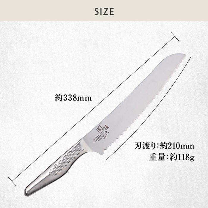 継ぎ目のない、一体構造のオールステンレスタイプ。人気のサイズ210mmのパン切り包丁です。