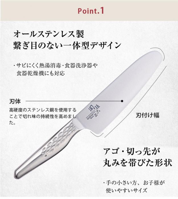 継ぎ目のない、一体構造のオールステンレスタイプ。アゴ・切っ先が丸みを帯びた形状。手の小さい方、子供でも使いやすいサイズです。