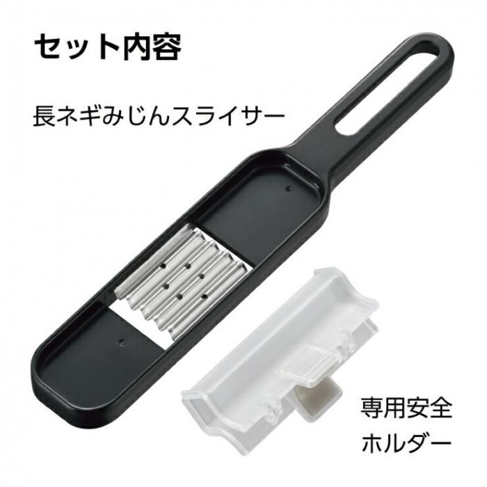 長ネギ専用の安全ホルダー付きで、安全に調理ができます。安全ホルダーはスライサーにセットして収納できます。