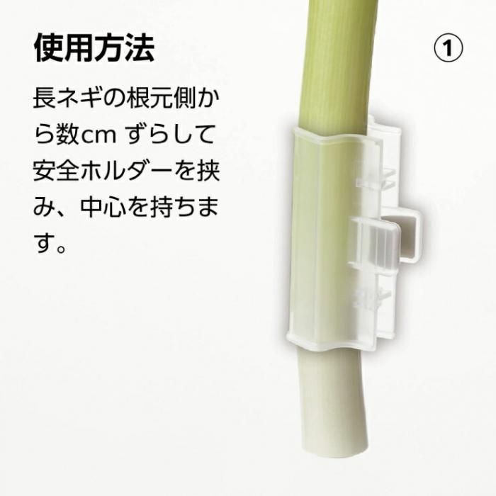 1.長ネギの根元側から数cmずらして安全ホルダーを挟み、中心を持ちます。