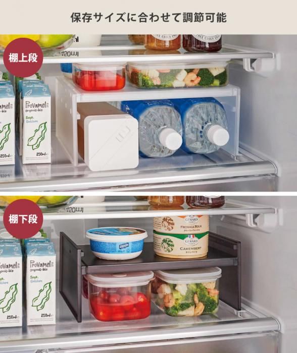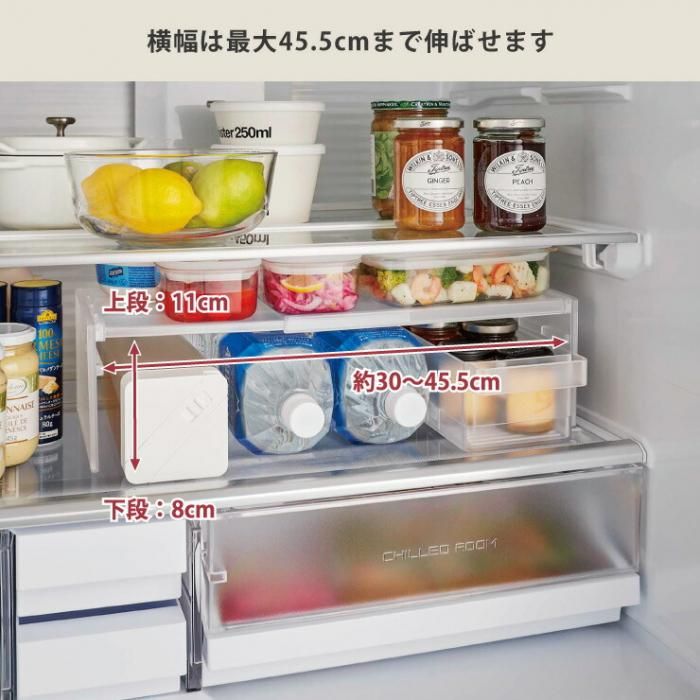 タワー 伸縮冷蔵庫中収納ラック 8065/8066 送料無料 当日出荷 分類で探す キッチングッズ キッチン収納 カゴ・バスケット・ボックス ブランドで探す 山崎実業 タワー tower 特集ページ 新生活に揃えたい おすすめ商品 キッチン 価格帯(税込) 2,000円台の商品 キッチン 送料無料 ラッピング承ります 幅と高さが調節できる 伸縮式の冷蔵庫中収納ラック 収納したいものに合わせて高さを選べますtower-8065-6 2,750円(税込)0円 在庫入荷待ちホワイト2,750円(税込)2,750円(税込)ブラック2,750円(税込)在庫なし2,750円(税込) 数量 カートに入れる 製品について性能詳細お買い物ガイドクロッカについて幅と高さが調節できる、伸縮式の冷蔵庫中収納ラック 幅と高さが調節できる、伸縮式の冷蔵庫中収納ラック。棚の高さは2段階に調節できます。差し込むだけの簡単組み立て。収納したいものに合わせて高さを選べます。 材質本体:PS樹脂 サイズ約W30〜45.5×D20×H12.6cm 重量約500g 耐荷重幅最小時:約3kg幅拡大時:約1.5kg (衝撃をゼロとした場合の静止耐荷重です。) 生産国中国 備考組立式 ブランド 製造元tower -タワー 山崎実業
