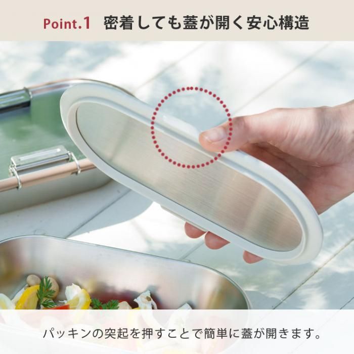 蓋はパッキン付きで、汁漏れを防ぎます。蓋がしっかり密着しても、パッキンの両脇に付いている突起部分を押すことで簡単に開けることができます。