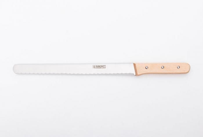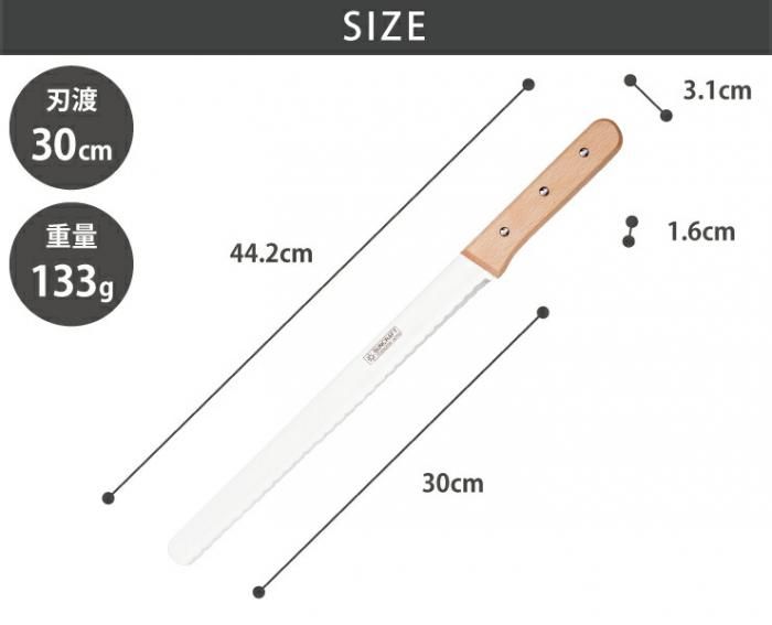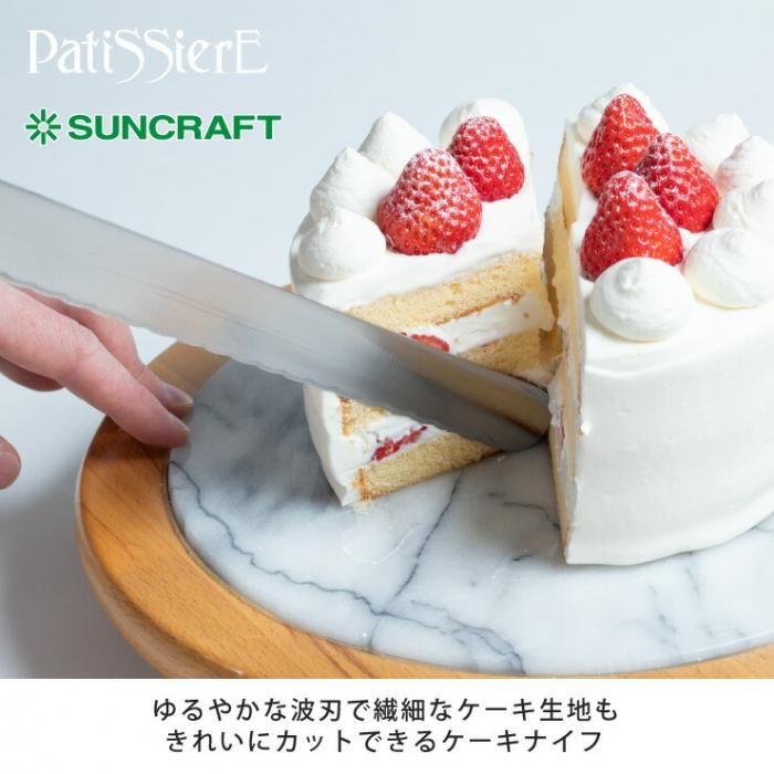 パティシエール ケーキナイフ 31cm PP-537 送料無料 当日出荷 分類で探す キッチングッズ キッチン小物 製菓用品 その他製菓用品 ブランドで探す サンクラフト パティシエール Patissiere 価格帯(税込) 2,000円台の商品 キッチン 送料無料 ラッピング承ります ゆるやかな波刃で繊細なケーキ生地を美しくカットできるケーキナイフ 刃渡りが約30cmあり 直径24cm位のスポンジケーキのスライスが楽にできます ハンドルは手になじむ天然木suncraft-pp-537 2,970円(税込)0円 在庫入荷待ちケーキナイフ2,970円(税込)2,970円(税込)在庫なし 数量 カートに入れる 製品について性能詳細お買い物ガイドクロッカについてゆるやかな波刃で繊細なケーキ生地を美しくカットできるケーキナイフ ゆるやかな波刃で繊細なケーキ生地をカット。刃渡り31cmのケーキナイフ。ハンドルは手になじむ天然木。直径24cm位のスポンジケーキのスライスが楽にできます。刃物産地、岐阜県関市で作られる切れ味のいい刃。ゆるやかな波刃で繊細なスポンジケーキなどの脆い生地もキレイにカットできます。30cmの刃渡りなので、大きなストロークでカットできます。フルーツやクリームなど硬さの違う層もキレイにカットできます。スポンジスライサー補助具を使う事で、同じ厚さで綺麗にスライス出来ます。 伝統あるケーキ職人(パティシエ・パティシエール)直伝のノウハウが活かされた、プロ志向・本物志向の方におすすめの製菓用品シリーズです。ご家庭で本格的な手づくりケーキを楽しみたい方のために開発されました。切れ味がよく、生地を傷めずにカットできるケーキナイフや高品質な国産の製造技術に裏打ちされた泡立てなど日本製の商品を多数取り揃えています。 サイズ約430×30×16mm、刃渡り:310mm 材質刃:ステンレス刃物鋼、ハンドル:天然木(ウレタン塗装) 重量約133g 生産国日本 備考食洗機使用不可 RERATED ITEMS関連商品タイガークラウン ウィズ シリコンスプーン 7236タイガークラウン ウィズ シリコンゴムヘラ 大 1610タイガークラウン ドレッジ 7019タワー 電子レンジ庫内汚れ防止シリコンマット 5039/5040貝印 BreadySELECT パン焼き型 クマ DL7015すみっコぐらし 立体チョコ型(しろくま-ぺんぎん-とんかつ-ねこ-とかげ) DN0505すみっコぐらし だっこクッキーセット しろくま&ふろしき DN0501/とんかつ&えびふらいのしっぽ DN0502すみっコぐらし 抜き型セット (ぺんぎん?-ねこ-とかげ) DN0500
