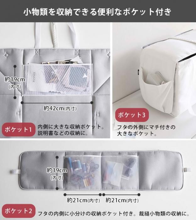 ポケット2:フタの内側に小分けの収納ポケット付き。裁縫小物類の収納に。