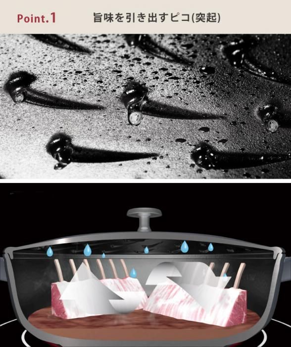 水蒸気は外気で冷やされた鍋に触れると液化し、ピコ(丸突起)を伝って雨のように食材に降り注ぎます。