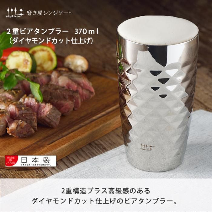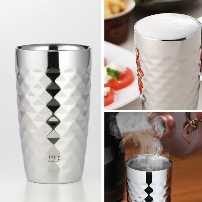 「2重ビアタンブラー 370ml」は、冷たいビールを注いでも表面に水滴が出来にくく、熱が伝わりにくい2重構造。ビールはもちろん、焼酎などのお湯割りでも楽しめます。