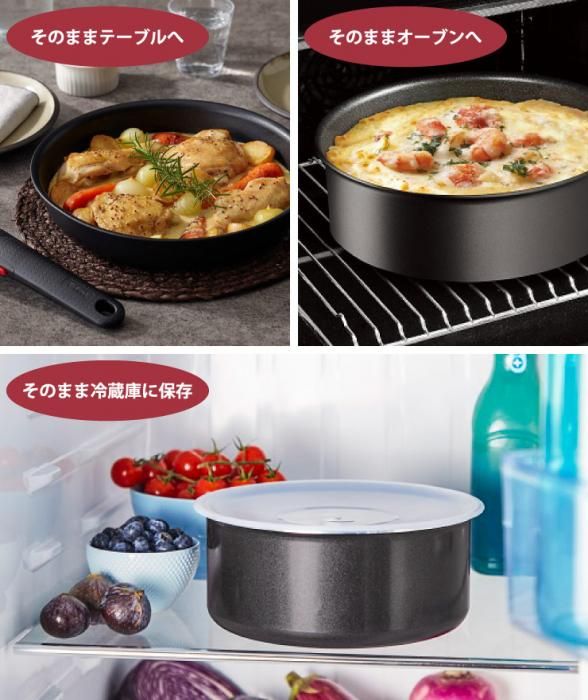 取っ手がとれるから重ねて収納ができて、キッチンがいつでもすっきり。熱々のままテーブルに出せるし、オーブンや冷蔵庫にそのまま入れることもできる。料理するときも保存するときも、洗うときも。ずっとノーストレスだから、料理が楽しくなります。