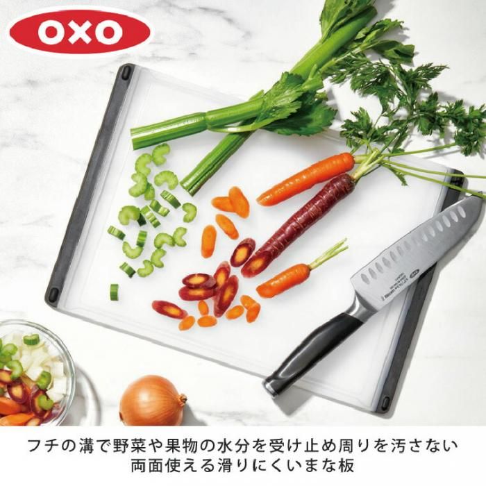 オクソー カッティングボード L 11272800 送料無料 分類で探す キッチングッズ キッチン小物 調理ツール まな板・カッティングボード ブランドで探す オクソー OXO 価格帯(税込) 3,000円台の商品 キッチン用品 送料無料 ラッピング承ります 両端についた滑り止めで 作業中も安定感があり 立てて乾かすときも滑りにくい仕様です フチ部分の溝は トマトや果物などの水分を受け止めて周りを汚しませんoxo-11272800 3,520円(税込)0円 在庫入荷待ちLサイズ3,520円(税込)3,520円(税込)在庫なし 数量 カートに入れる 製品について性能詳細お買い物ガイドクロッカについて両面使える滑りにくいまな板 両端についた滑り止めで、作業中も安定感があり、立てて乾かすときも滑りにくい仕様です。フチ部分の溝は、トマトや果物などの水分を受け止めて周りを汚しません。たまった水分はコーナーからすっと捨てられて便利です。溝のない面はフラットなので、切った食材をボウルやお鍋に移すのに便利です。フチが斜めにカットされているので、片手でも持ち上げやすく快適です。軽量なので扱いやすく毎日のお料理に活躍します。 漂白剤、食器洗い乾燥機がご使用いただけます。 サイズ約縦37.5×横26.4×高さ1.3cm 重量約695g 材質ポリプロピレン/熱可塑性エラストマー 耐熱温度120℃ 生産国中国 備考食洗機使用可、漂白可BPAフリー サイズS M Lブランドoxo -オクソーRERATED ITEMS関連商品ジョセフジョセフ まな板 2トーン 092530ジョセフジョセフ チョップ2ポット プラス ホワイト/グリーン/レッド