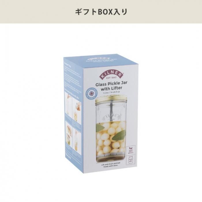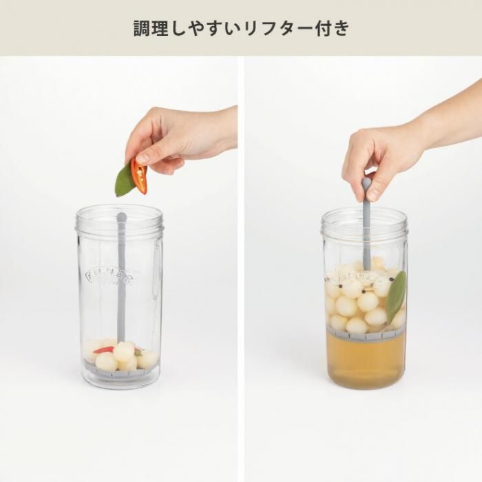 シリコーン製リフターを上に引っ張るだけで液体から食材だけを分離でき、手早く簡単にピクルスを取り出すことができます。