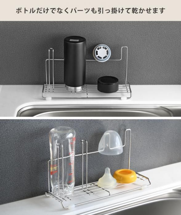 哺乳瓶やペットボトル、瓶などの乾燥にも。蓋やパーツも一緒に置けます。