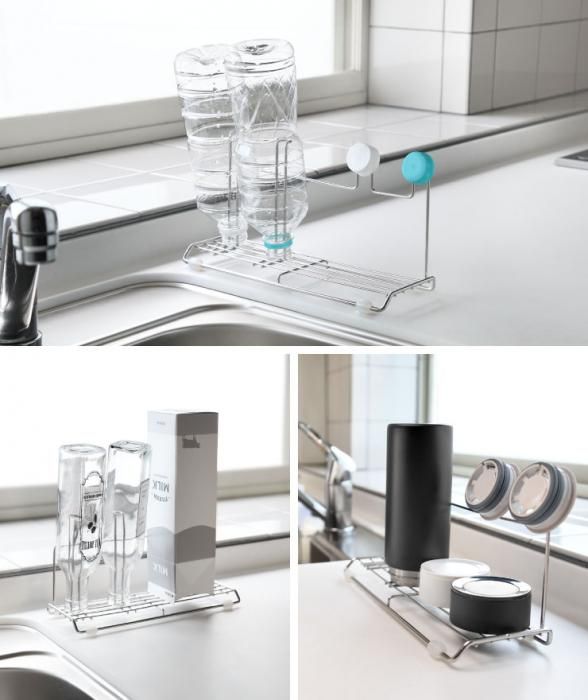 水筒やボトルを支柱に立てて安定して水切りができます。蓋やパッキンも引っ掛けて水切り。