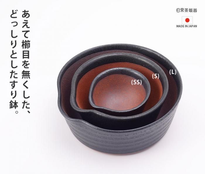 櫛目のないすり鉢はSS、S、Lの3サイズご用意しています。3つのサイズを重ねて収納することができます。※土を主成分とする陶器は、焼成により様々な表情が出ます。すり目の茶色部分は焼成条件により釉薬の濃淡やムラが出ることがあります。
