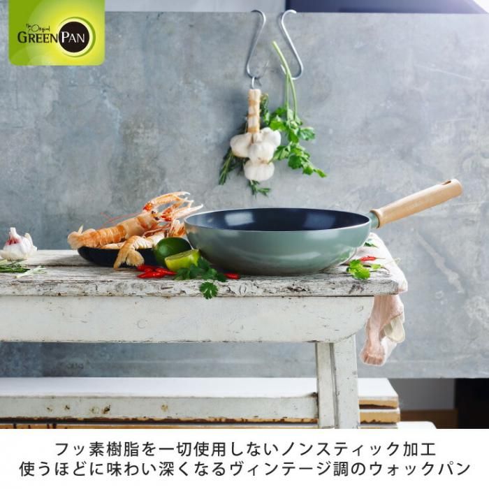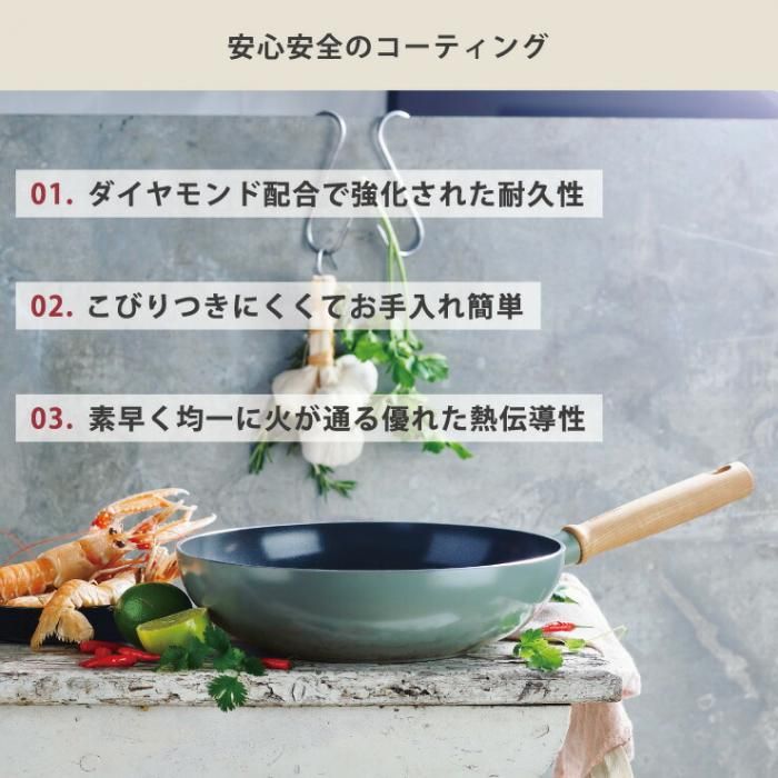 木製ハンドルを採用したヴィンテージ調の美しいデザインが魅力のメイフラワーシリーズ グリーンパンは「サーモロン・セラミック・コーティング」という特殊なノンスティック加工を施しています ハンドルは使えば使うほど風合いが豊かになる天然木ならではの変化をお楽しみいただけます