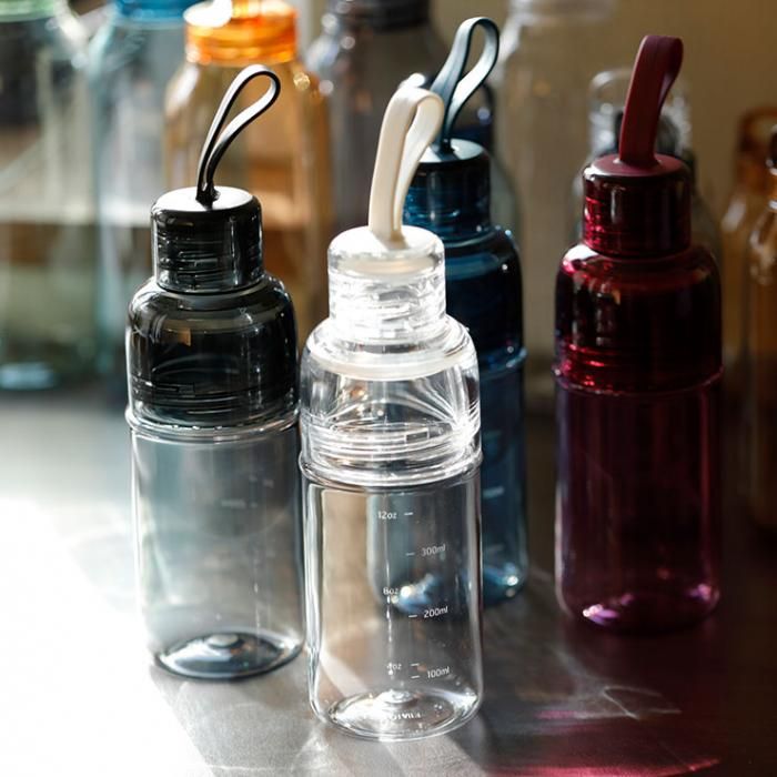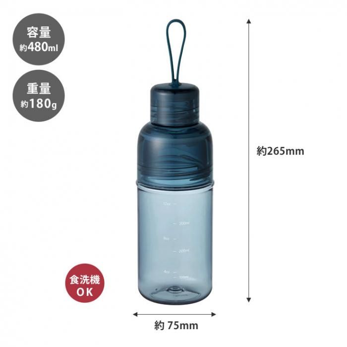 ボトル本体にはスポーツドリンクなどを作る際の目安となる目盛が付いています。水分の摂取量を把握できるよう、ガラスのような高い透明度を誇る高品質な樹脂素材を採用しました。軽くて割れにくく、アクティブなスポーツシーンに最適です。