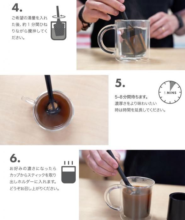 6. お好みの濃さになったらカップからスティックを取り出しホルダーに入れます。