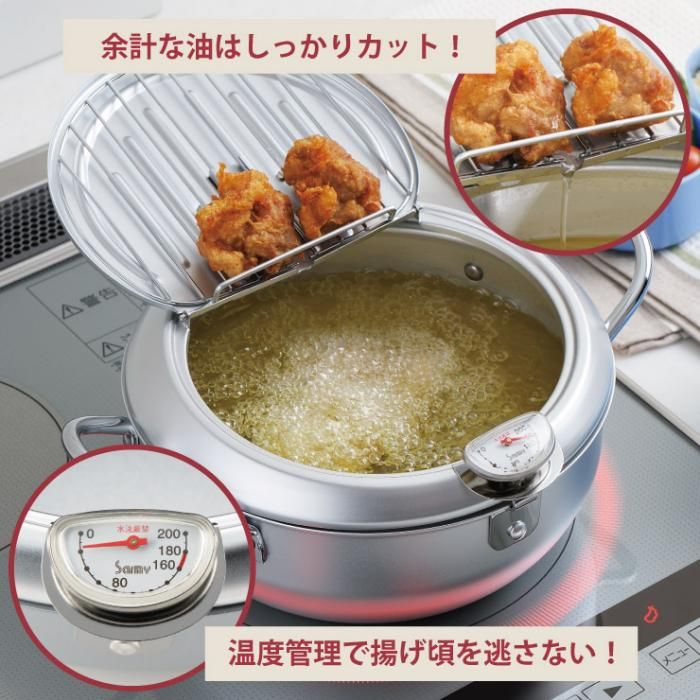 ヨシカワ 味楽亭 II 天ぷら鍋24cm SJ1025 送料無料 分類で探す キッチングッズ 鍋 天ぷら鍋 ブランドで探す ヨシカワ 価格帯(税込) 5,000円台の商品 キッチン用品 送料無料 ラッピング承ります フタ裏で油切り 油は溝を伝って鍋の中に戻る設計の天ぷら鍋 温度管理の大切な天ぷら料理も温度計が付いているから適温がひとめで分かって安心ですyoshikawa-sj1025 メーカー希望小売価格13,750円(税込) 5,610円(税込)0円 SOLD OUT 製品について性能詳細お買い物ガイドクロッカについてフタ裏で油切り、油は溝を伝って鍋の中に戻る設計 温度管理の大切な天ぷら料理も温度計が付いているから適温がひとめで分かって安心。フタの裏部分には油切りができるアミ付き。余分な油は鍋に戻る設計になっています。本体とガードを留めるストッパー付きで揚げ物をのせてもひっくりかえらず、安定感抜群です。本体には、揚げ終わった油をオイルポットなどに移し替えるときに便利な注ぎ口付き。油はねガードやアミは取り外して水洗いできます。 サイズ径25.8×高さ8.0cm(フタ含む高さ:13.7cm)、全幅32.1cm 重量約1,660g 容量満水容量:3.1L、適正容量:1.3L 材質本体:鉄(1.6mm,シリコーン焼付塗装)ハンドル:鉄(クロムメッキ)フタ,ガード,網:鉄(シリコーン焼付塗装) 対応熱源ガスコンロ、IH調理器、シーズ、ハロゲン、エンクロ、ラジエント 生産国○ 温度計は防水ではありません。水洗いしないでください。○ 食洗機では使用できません。 サイズ 適正油量 20cm 700ml 24cm 1300ml製造元ヨシカワRERATED ITEMS関連商品ヨシカワ 味楽亭 II 天ぷら鍋20cm SJ1024タワー マグネットシリコーン鍋つかみ 2個組 1957/1958