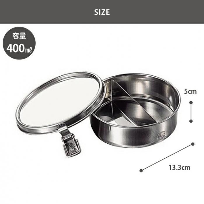 シンプルで丈夫なステンレス製ランチボックス。バックルロックタイプの丸型弁当箱。お子様のお弁当箱としてもおすすめの400mlサイズ。