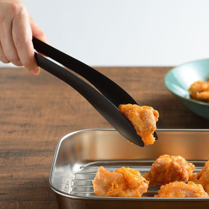 盛りつけに適した形状のトング。特許取得のバネ構造と開き角度にこだわり、やわらかな使い心地を実現。