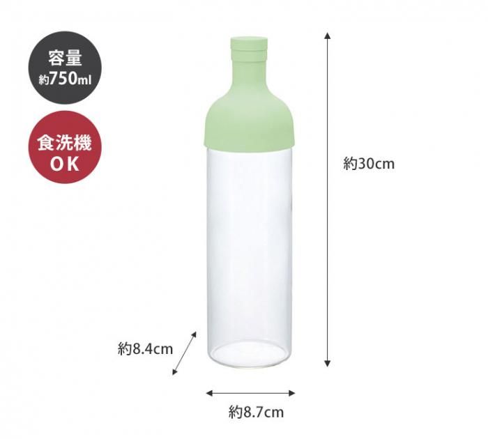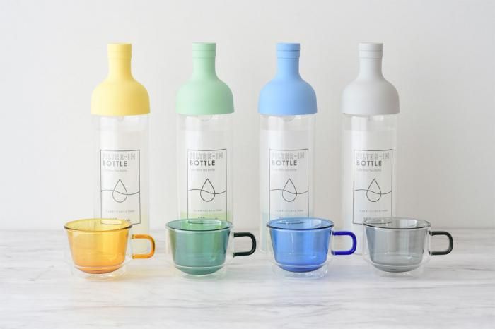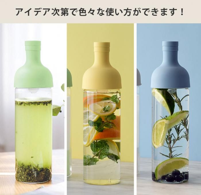 365メソッド×ハリオ フィルターインボトル 750ml 送料無料 分類で探す キッチングッズ 食器・カトラリー コーヒー・お茶用品 茶ポット・冷水筒 ブランドで探す ハリオ HARIO 価格帯(税込) 2,000円台の商品 キッチン 送料無料 ラッピング承ります ワインボトルを模したスタイリッシュな形状の水出し茶ボトル 注ぎ口にフィルターがセットされているので茶葉が入ったまま注げます デトックスウォーターやサングリアなどにも365methods-fb 2,200円(税込)0円 在庫レモンイエロー2,200円(税込)在庫なしミントグリーン2,200円(税込)在庫なしベビーブルー2,200円(税込)在庫なしライトグレー2,200円(税込)在庫なし SOLD OUT 製品について性能詳細お買い物ガイドクロッカについてワインボトルを模したスタイリッシュな形状の水出し茶ボトル 耐熱ガラスのボトルに水切れの良いシリコンの注ぎ口をプラスした水出し茶ボトルです。ワインのように食事の時に水出し茶を愉しんでいただきたいという思いからできた、ワインボトル型のフィルターインボトル。注ぎ口部分にフィルターがセットされているので茶葉が入ったまま注げます。「水出し茶」とは、お湯ではなく、最初から水で淹れる低温抽出方法。ゆっくり時間をかけて抽出するので、茶葉本来の旨味が味わえます。 作り方は、茶葉を15g入れてから水を750ml注ぎ、フィルターをセットしたら冷蔵庫で3〜6時間抽出するだけで完成。直径約8cmで冷蔵庫のドアポケットにも収まるサイズです。お茶の旨みが底に沈殿しますので、お召し上がりの前に攪拌するとより美味しくいただけます。茶葉により抽出時間が異なりますので、お好みで加減してください。6時間程抽出するととより深みのあるお茶が楽しめます。 フルーツを切って、ミントや茶葉と一緒に水出しにしたり、ワインを入れてサングリアにするのもおすすめです。 明るく爽やかなレモンイエロー・ミントグリーンに加え、涼やかな雰囲気を演出するベビーブルーと人気定番のライトグレーの4色からお選びいただけます。 サイズW8.7×D8.4×H30cm 実用容量750ml 商品重量約400g 材質本体:耐熱ガラス(耐熱温度差 120℃)注ぎ口:シリコーンゴム(耐熱温度 180℃)フィルター:ポリプロピレン(耐熱温度 120℃) 備考○食洗機対応○塩素系漂白剤使用可○抽出した水出し茶は早めにお召し上がりください。 製造元HARIO ハリオRERATED ITEMS関連商品365methods × ハリオ ダブルウォール カラーマグカップ 240ml及源鋳造 OIGEN南部鉄器 急須 たまご型 0.55L ステンレス茶こし付き(ピンク・グリーン・ブルー)タテヨコ スリムピッチャー 1.4Lタテヨコ スライドピッチャー 1.3Lタテヨコ ワンプッシュピッチャー 2.2L K-1284タテヨコ ワンプッシュピッチャー 1.2L