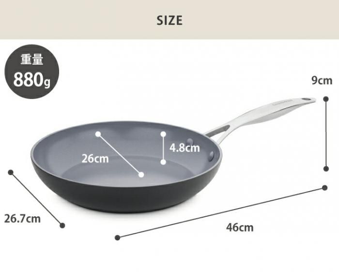 2〜3人分の調理にちょうど良い26cmフライパン。家族世帯では必ず持っておきたいサイズの一つ。万能なサイズ感はどんな料理にもおすすめ。