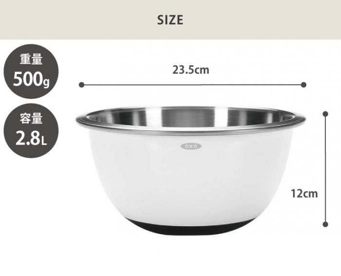 オクソー ステンレス ミキシングボウル(中)ホワイト OXO 1071827 送料無料 分類で探す キッチングッズ 食器・カトラリー 食器 その他食器 ブランドで探す オクソー OXO 価格帯(税込) 4,000円台の商品 キッチン用品 送料無料 ラッピング承ります 深めのデザインは電動のブレンダーにも最適 臭い移り 色移りも気にせず使えるステンレスの内装のミキシングボウル oxo-1071827 4,730円(税込)0円 在庫入荷待ちミキシングボウル(中)4,730円(税込)4,730円(税込)在庫なし 数量 カートに入れる 製品について性能詳細お買い物ガイドクロッカについて深めのデザインが電動のブレンダーにも最適なミキシングボウル 臭い移り、色移りも気にせず使えるステンレスの内装のミキシングボウル。低温、高温の材料の熱から手を守るプラスチックの外装。底面のゴムは混ぜているときも滑りにくく安定感が抜群です。深めのデザインは電動のブレンダーにも最適。 漂白剤はご使用いただけません。食器洗い乾燥機がご使用いただけます。 サイズ約W23.5× D23.5 × H12cm 重量約500g 容量約2.8L 材質本体:ポリプロピレン、熱可塑性エラストマー、ステンレス鋼 耐熱温度本体:120℃ 生産国中国 備考食器洗乾燥機使用可漂白剤使用不可 ブランドoxo -オクソーRERATED ITEMS関連商品BMS バット S 30取 富士ホーローBMS バット M 21取 富士ホーローBMS バット L 18取 富士ホーローBMS バット LL 15取 富士ホーロー富士ホーロー BMS 片口 ボウル 12cm 0.4L富士ホーロー BMS 片口 ボウル 15cm 0.8L富士ホーロー BMS 片口 ボウル 18cm 1.2L富士ホーロー BMS 片口 ボウル 20cm 1.7L