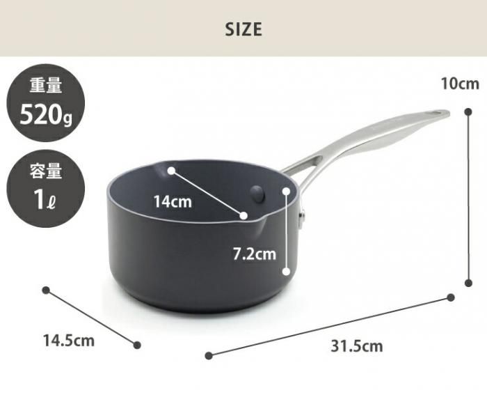 グリーンパンの中で唯一のミルクパン。ドリンクの温めや少量のお湯を沸かしたり、ソース作りなどにもおすすめです。有害物質を含まないセラミックコーティングなので、離乳食の調理にも安心して使えます。