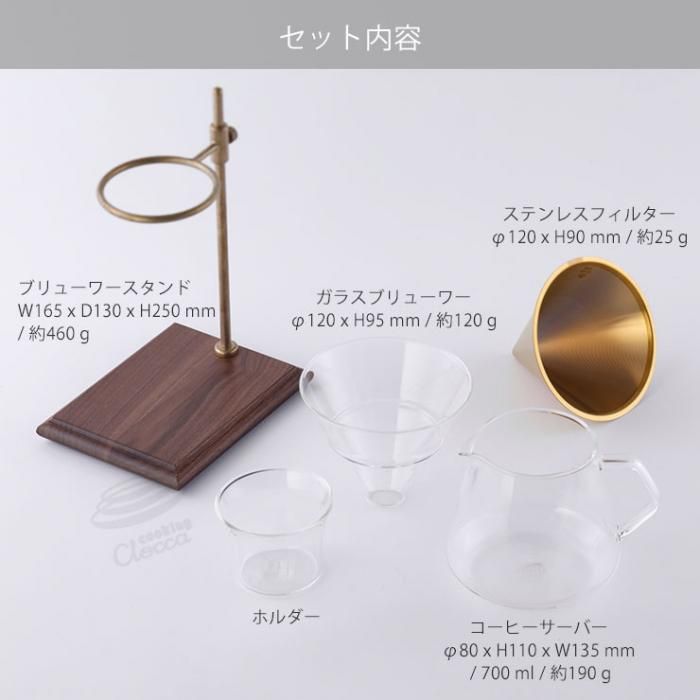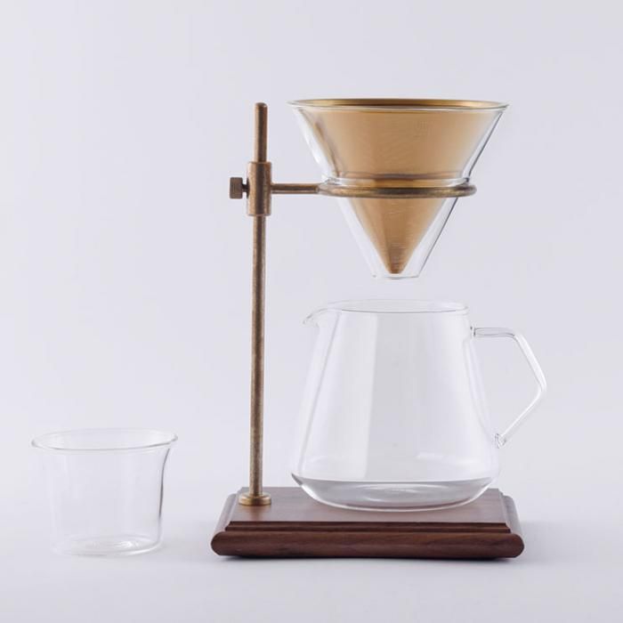 いつものコーヒータイムに至福のひとときをもたらす、重厚感のある佇まいのスタンドとゴールドに輝くフィルターが魅力のセットです。