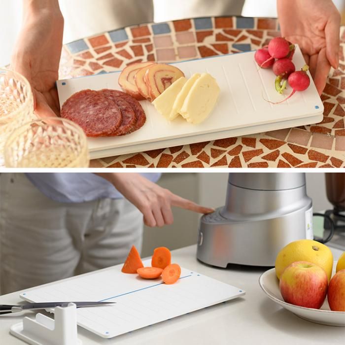 折りたたんでコンパクトに収納できる抗菌まな板。洗ってそのまま立て掛けられる専用ホルダー付き。ホルダーには水受けがついているので、水切りしながら衛生的に収納できます。