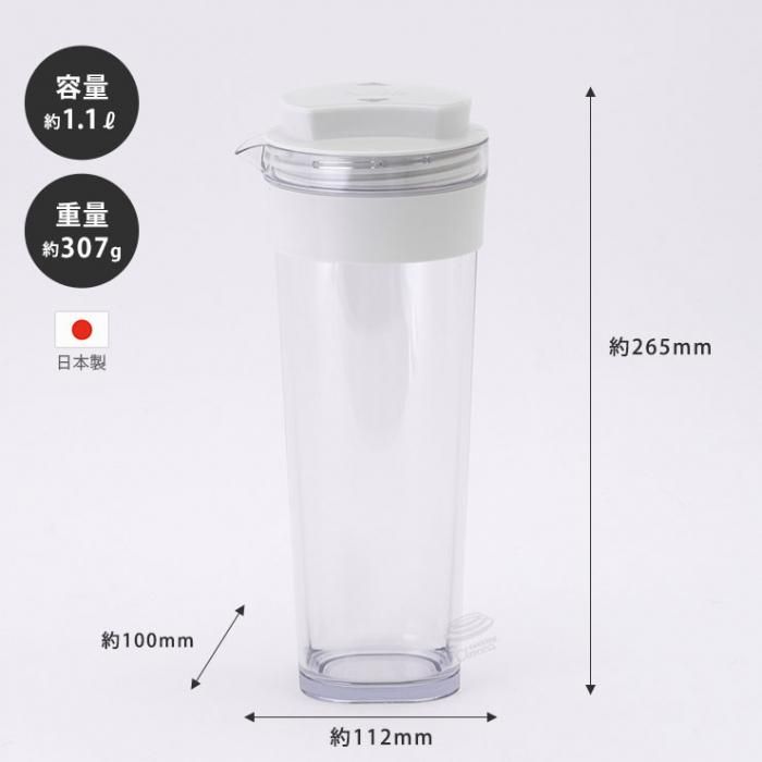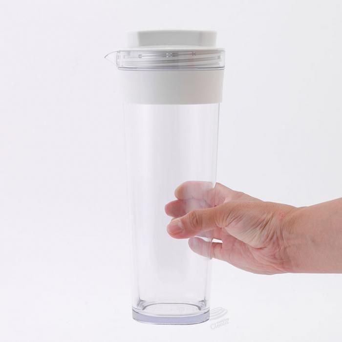 冷蔵庫のドアポケットにスッキリ収まる、スリムタイプの冷水筒。フタを回して傾けるだけで簡単に注げます。フタは手にフィットして握りやすい形状です。