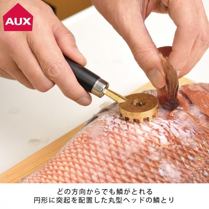 小ぶりな丸型ヘッドで、向きを気にせず鱗が取れる、真鍮製の鱗取り