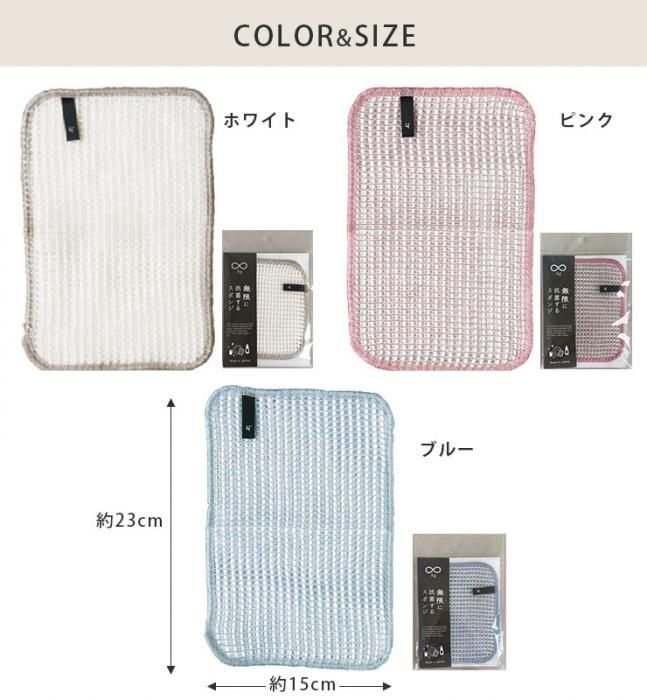 抗菌効果が長く続くスポンジ。少し粗いニットの二層構造。泡切れの良さと速乾性に優れています。