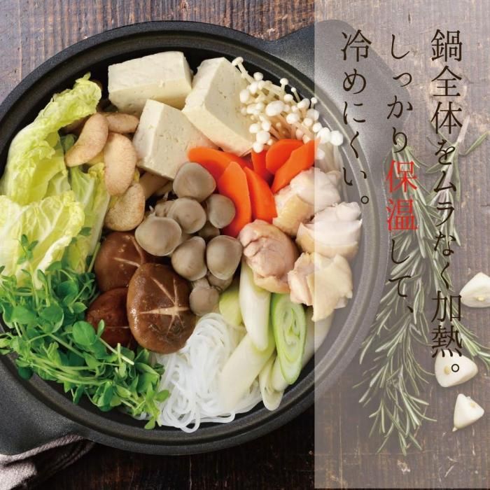 鍋全体をムラなく加熱、しっかり保温して冷めにくい、アルミダイキャスト製の卓上鍋。