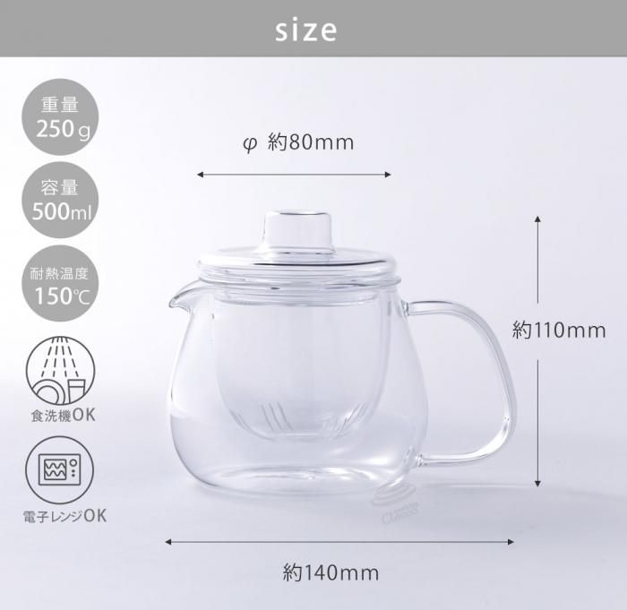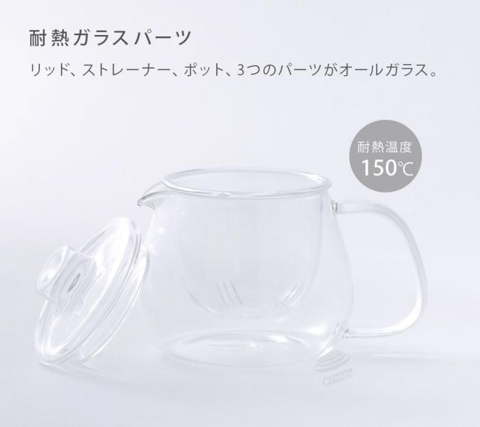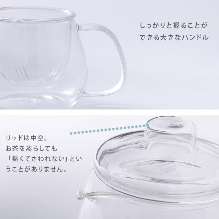 ユニティ ティーポット 450ml 8363 分類で探す キッチングッズ 食器・カトラリー コーヒー・お茶用品 ティーポット ブランドで探す キントー ユニティー UNITEA 価格帯(税込) 2,000円台の商品 キッチン 送料無料 ラッピング承ります オール耐熱ガラス製のスケルトンなティーポット リッドは中空になっているので 長くお茶を蒸らしても「熱くてさわれない」ということがありませんkinto-8363 2,200円(税込) SOLD OUT 製品について性能詳細お買い物ガイドクロッカについてオール耐熱ガラス製のスケルトンなティーポット 親しみやすいゆったりとしたフォルムでどんなシーンにも、どんな空間にもさりげなく溶け込んでいくUNITEA。 リッド、ストレーナー、ポット、3つのパーツがオールガラス。そのスケルトンなティーポットに、茶葉がゆったりと開く様子を眺めながら、リラックスした時間が流れます。リッドは中空になっているので、長くお茶を蒸らしても「熱くてさわれない」ということがありません。 サイズ幅14 × 奥行8 × 高さ11cm 容量満水容量:500ml、適正容量:450ml 重量約250g 材質耐熱ガラス(耐熱温度差 150℃) 生産国中国 備考○ 食洗機使用可○ 電子レンジ使用可○ 洗浄の際はクレンザーやたわしを使用しないでください。○ 直火(ティーライトキャンドルのみ)使用可。ティーライトキャンドル以外の炎で直火にかけないでください。 製造元KINTO -キントーRERATED ITEMS関連商品及源鋳造 OIGEN南部鉄器 急須 たまご型 0.55L ステンレス茶こし付き(ピンク・グリーン・ブルー)タテヨコ スリムピッチャー 1.4Lタテヨコ スライドピッチャー 1.3Lタテヨコ ワンプッシュピッチャー 2.2L K-1284タテヨコ ワンプッシュピッチャー 1.2Lタテヨコ ラージピッチャー 3.0L