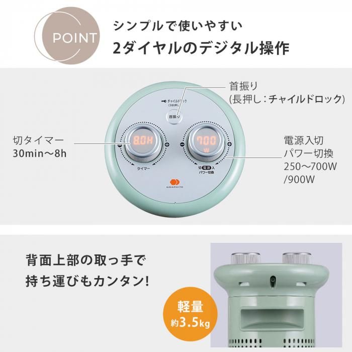 発熱のパワーやタイマーは2つのダイヤルで調節します。ダイヤルを回すと数字が光って表示されるので、暗い場所でも操作が可能です。チャイルドロックも搭載。