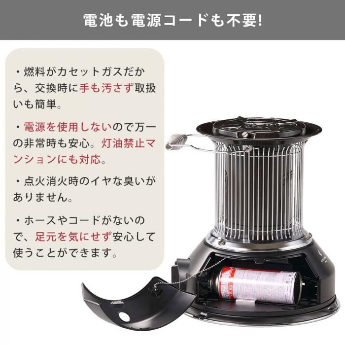 電池、電源、灯油も不要で、カセットガスを燃料とした暖房器具