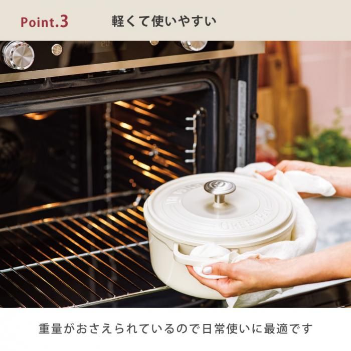 従来の鉄製鋳物鍋の約半分の重さでありながら、耐久性の非常に高いダイヤモンド配合のサーモロン・セラミックコーティングによるこびりつき難さはもちろんのこと、優れた熱伝導性、高い保温性も兼ねそなえています。
