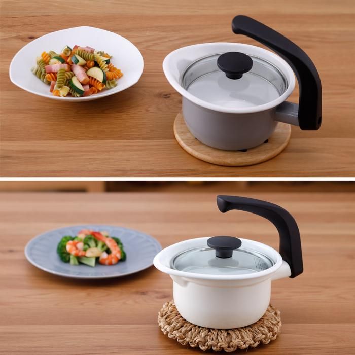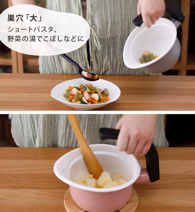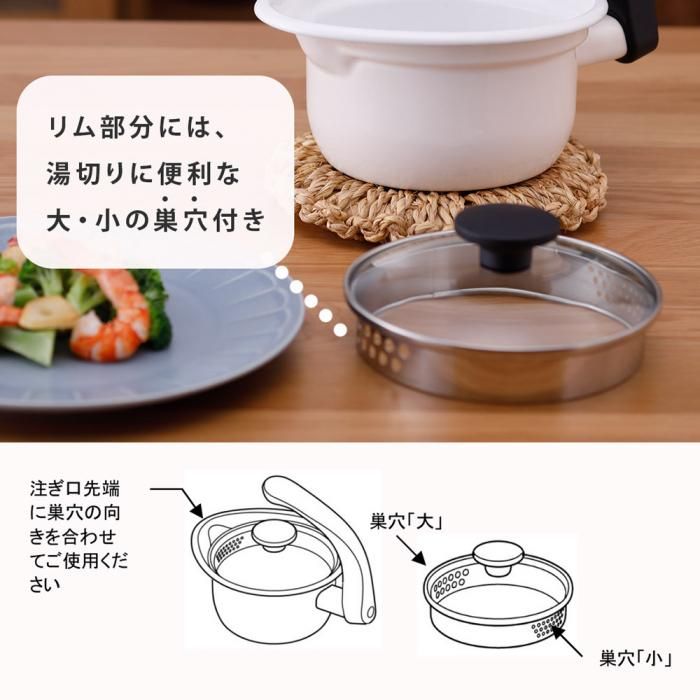 富士ホーロー えーなポット 1.4L EP-1.4L 送料無料 分類で探す キッチングッズ 鍋 片手鍋 ブランドで探す 富士ホーロー 価格帯(税込) 4,000円台の商品 キッチン用品 送料無料 ラッピング承ります 便利な湯切り穴付き レトロフューチャーなフォルムでハンドルが邪魔にならないホーロー片手鍋 え〜な ポット ショートパスタや野菜を茹でる際や茶葉や出汁をとる時にも便利です fuji-ep14l メーカー希望小売価格4,950円(税込) 4,950円(税込) 0円 会員価格: 3,465円(税込) 30%off 在庫入荷待ちアッシュピンク4,950円(税込)在庫なし4,950円(税込)在庫なしライトグレー4,950円(税込)在庫なし4,950円(税込)在庫なしホワイト4,950円(税込)在庫なし4,950円(税込)在庫なし SOLD OUT 製品について性能詳細お買い物ガイドクロッカについて 湯切りする食材に合わせて巣穴を使い分け! レトロフューチャーなフォルムのホーロー片手鍋 レトロフューチャーなフォルムの片手鍋。琺瑯の優しい素材感をまとった「え〜なポット」。ハンドルが上部にあるので、コンロで邪魔になりにくい形状です。 調理の具合が確認しやすいガラス蓋には大・小の巣穴付き。湯切りする食材の大きさに合わせて使い分けられます。「大」はショートパスタや野菜を茹でる際の湯切りに、「小」は茶葉や出汁をとる時に便利です。 ホーローは表面がガラス質で食材と化学反応を起こさないので、料理が美味しく仕上がります。毎日の味噌汁作りやジャム作りなどにもおすすめです。 サイズ約W23.5×D17.5×H18cm 重量約1,030g 容量満水容量:1.4L適正容量:約0.7L 材質本体:ほうろう用鋼板(底の厚さ1.0mm)蓋:強化ガラス、ハンドル,つまみ:フェノール樹脂 対応熱源ガスコンロ(直火),IH調理器(100V/200V),シーズ,ハロゲン,ラジエントIH調理器では、レベル「中」以下からはじめて、徐々に温度を上げてご使用ください。IH調理器の揚げ物モード、天ぷらモードなどではご使用いただけません。 ホーローについて 手作業で釉薬を掛けるため、ひとつひとつの表情には多少の個体差が生じます。 ホーローの性質上、焼成時に黒点や色むらの様に見える部位が生じる場合がございます。 鋼板の切り口となる部分は釉薬がかかりにくく、下地の黒いスジが多少見られますが黒い部分もホーロー加工が施されております。上記の様な場合でも不良ではなくご使用には問題ございませんので安心してお使い下さい。 備考 タイ工場製(富士ホーロー 自社工場) 電子レンジ使用不可 日本琺瑯工業会認定S(200V IH)マーク取得 製造元富士ホーロー -ふじほうろうふじほーろーRERATED ITEMS関連商品富士ホーロー ミルクパン 14cm 0.8L ホワイト/パープルアッシュ/スモークブルー C-A14M富士ホーロー ミルクパン 15cm C-15M富士ホーロー ミニソースパン 12cm 0.8L C-12S