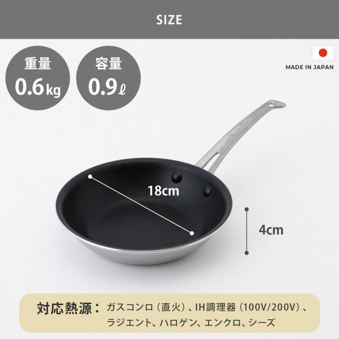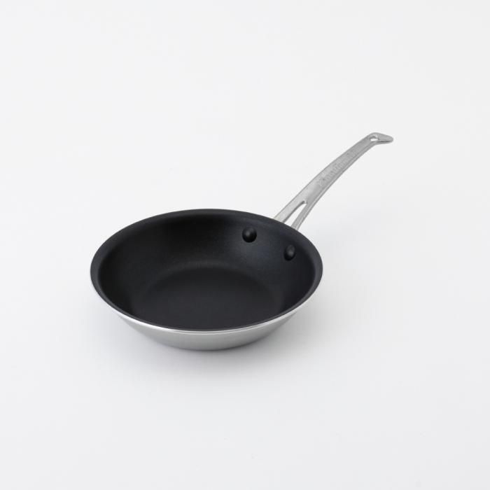 フライパン側面は磁力の反応に優れ耐食性の高い445M2ステンレス材を全面に使用。また、あいだには極厚2.6mmのアルミ材をはさむことにより熱ムラが少なく、側面までしっかり加熱されます。そのため、オムレツやパンケーキもきれいに仕上がります。