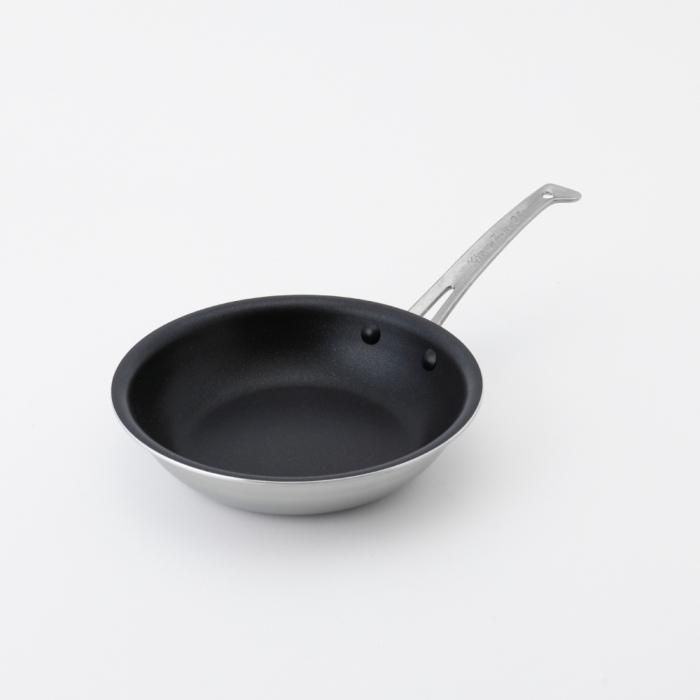 フライパン側面は磁力の反応に優れ耐食性の高い445M2ステンレス材を全面に使用。また、あいだには極厚2.6mmのアルミ材をはさむことにより熱ムラが少なく、側面までしっかり加熱されます。そのため、オムレツやパンケーキもきれいに仕上がります。