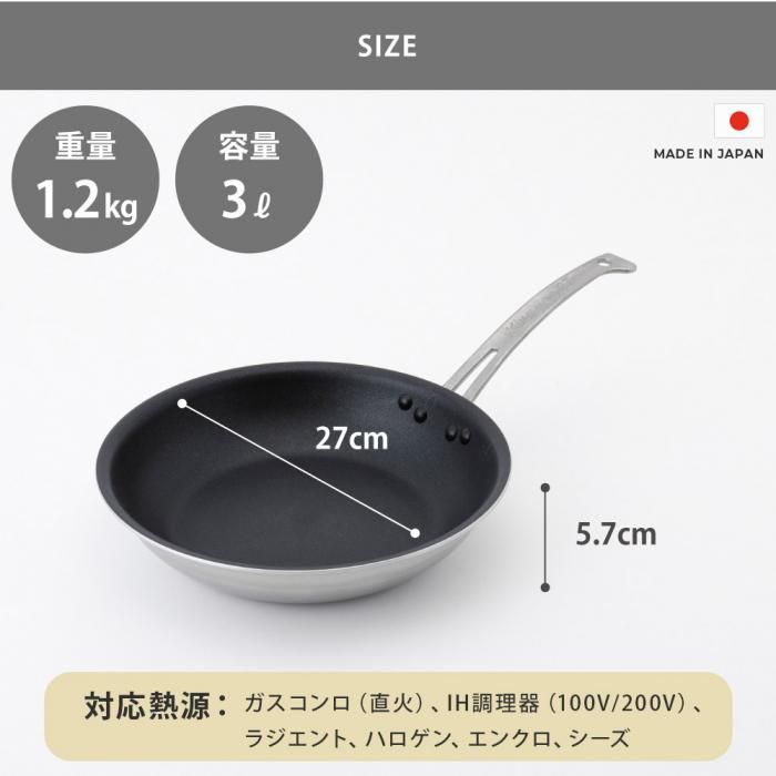一流料理人ご用達の熱伝導性と耐久性に優れたフライパン 高効率ステンレスと極厚アルミの合金を使用 IH ガス両用 焼く 炒める 揚げる ほとんどの調理に使えます