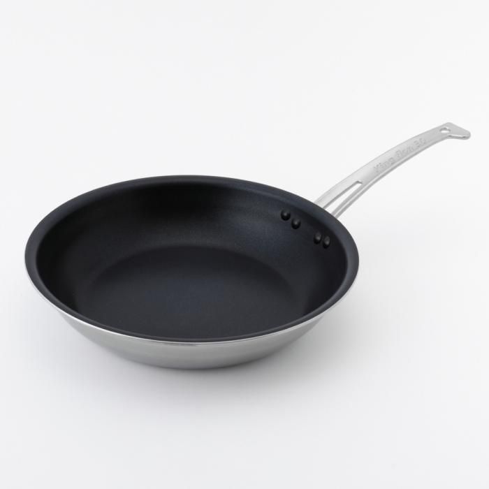 フライパン側面は磁力の反応に優れ耐食性の高い445M2ステンレス材を全面に使用。また、あいだには極厚2.6mmのアルミ材をはさむことにより熱ムラが少なく、側面までしっかり加熱されます。そのため、オムレツやパンケーキもきれいに仕上がります。
