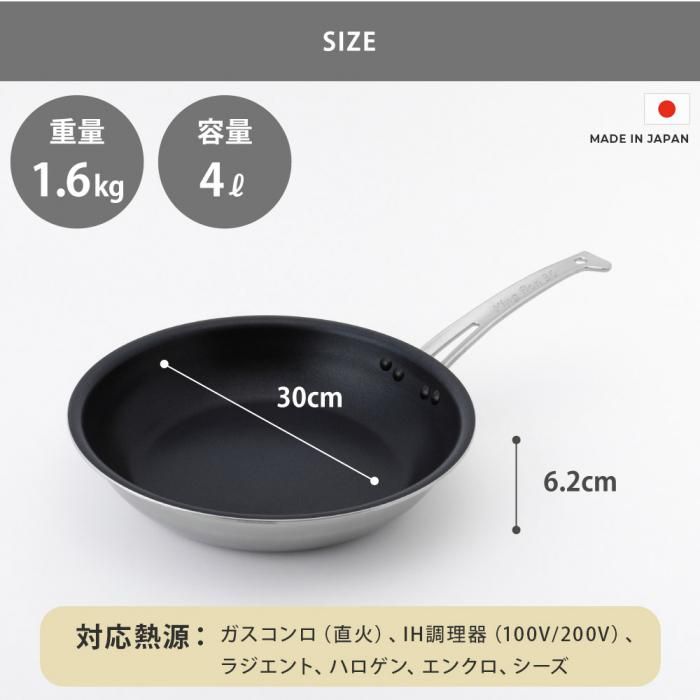 コーティングはセラミック配合の3層ハードフッ素樹脂加工で耐久性にも優れています。熱ムラが無くスピーディーに炒め物や炒め煮、パスタなどの料理が出来ます。
