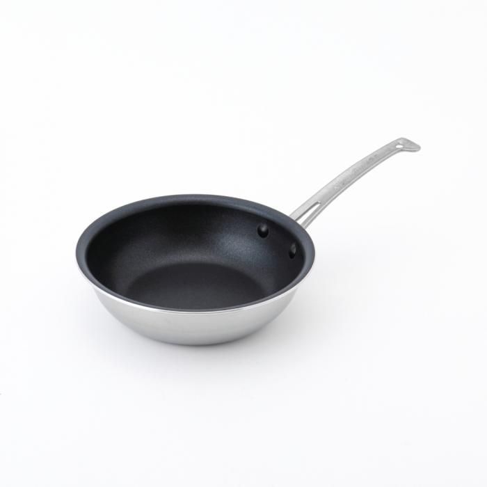 フライパン側面は磁力の反応に優れ耐食性の高い445M2ステンレス材を全面に使用。また、あいだには極厚2.6mmのアルミ材をはさむことにより熱ムラが少なく、側面までしっかり加熱されます。そのため、オムレツやパンケーキもきれいに仕上がります。