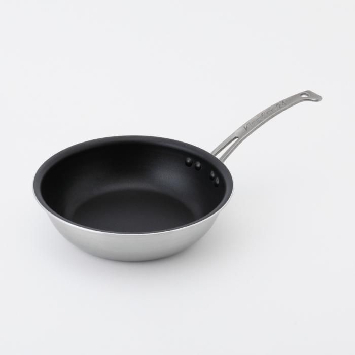 フライパン側面は磁力の反応に優れ耐食性の高い445M2ステンレス材を全面に使用。また、あいだには極厚2.6mmのアルミ材をはさむことにより熱ムラが少なく、側面までしっかり加熱されます。そのため、オムレツやパンケーキもきれいに仕上がります。